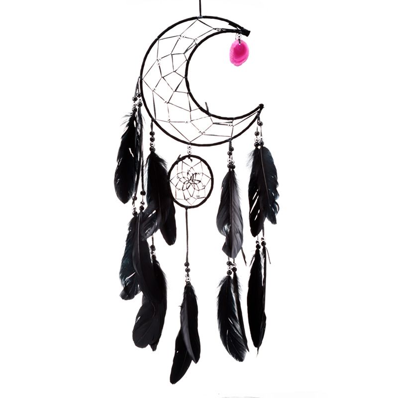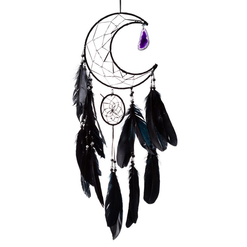 Álomfogó, Tollal és Achát Függővel - Fekete - Holdsarló - 20cm